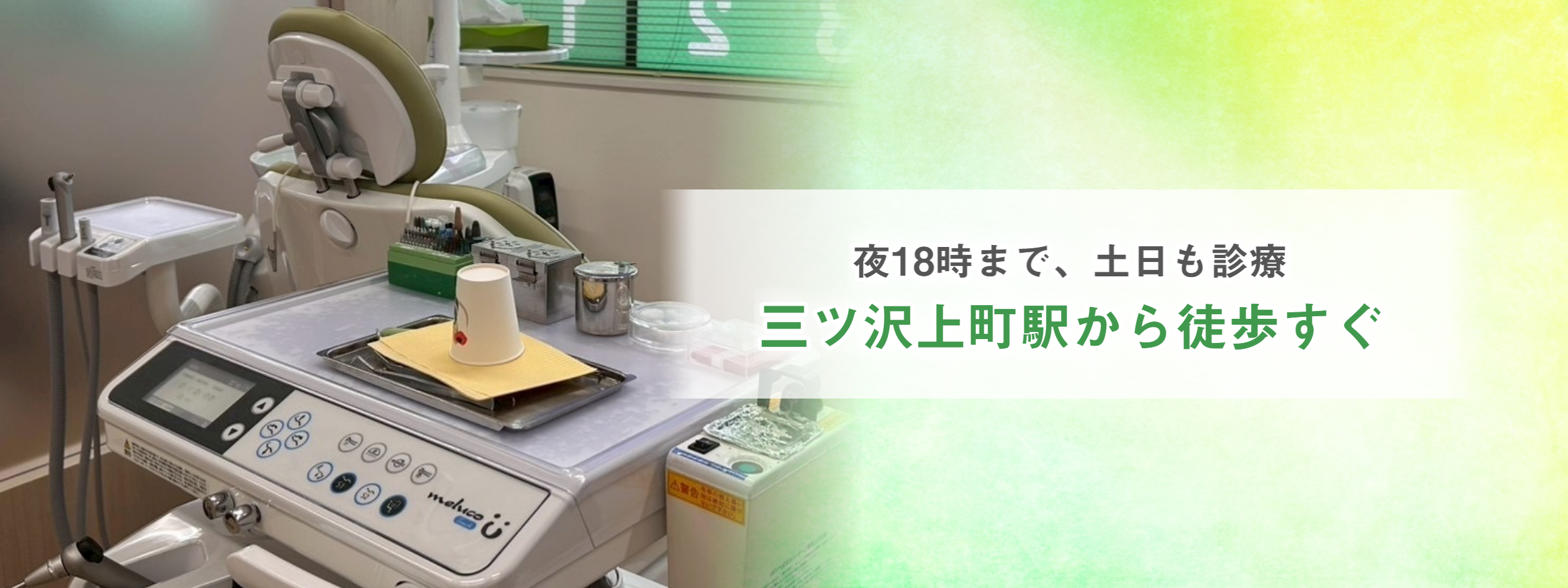 当院は、横浜市神奈川区の横浜市営地下鉄ブルーライン三ツ沢上町駅から徒歩すぐの歯科医院。平日は18時まで、日曜も診療しています。虫歯、歯周病、口腔外科、訪問歯科診療まで幅広く対応。お口のお悩みなら、お気軽に「三ツ沢上町歯科医院」までご相談ください。